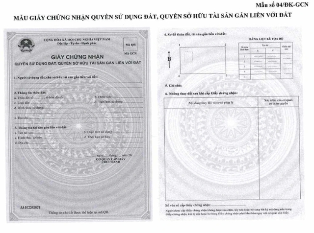 Giấy chứng nhận quyền sử dụng đất, quyền sở hữu tài sản gắn liền với đất gồm một 1 tờ có 2 trang, in nền hoa văn trống đồng, màu hồng cánh sen, có kích thước 210 mm x 297 mm, có Quốc huy, Quốc hiệu, dòng chữ "Giấy chứng nhận quyền sử dụng đất, quyền sở hữu tài sản gắn liền với đất", số phát hành Giấy chứng nhận (số seri) gồm 02 chữ cái tiếng Việt và 08 chữ số, dòng chữ "Thông tin chi tiết được thể hiện tại mã QR", số vào sổ cấp Giấy chứng nhận và nội dung lưu ý đối với người được cấp Giấy chứng nhận (được gọi là phôi Giấy chứng nhận).