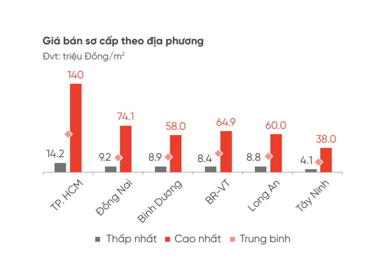 Về mức giá sơ cấp, theo dữ liệu của DKRA Group, Tp.HCM tiếp tục ở ngưỡng cao từ 140 triệu đồng/m2 (giá cao nhất), trong khi tại Bình Dương, Long An, Bà Rịa – Vũng Tàu, Đồng Nai giá sơ cấp lần lượt là 58 triệu/m2, 60 triệu đồng/m2, 64 triệu đồng/m2, 74 triệu đồng/m2 (giá cao nhất). Theo đó, các dự án đất nền quanh ngưỡng giá từ 10-25 triệu đồng/m2 tại khu lân cận Tp.HCM ghi nhận thanh khoản tốt. Mức độ tăng giá dự báo còn giá gia tăng trong thời gian tới, đi cùng các yếu tố hạ tầng, quy hoạch được thúc đẩy song song.